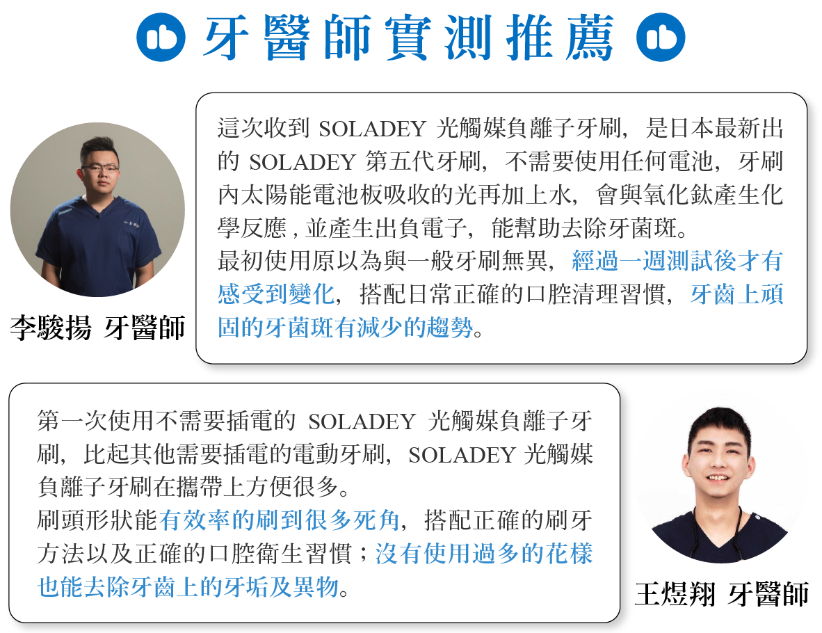 【SOLADEY 5|光觸媒負離子牙刷】在日本及各國都獲得口腔專家的推薦和肯定,團隊這次也請到高竿牙藝牙醫診所的幾位牙醫師實際試用來測試產品性能。