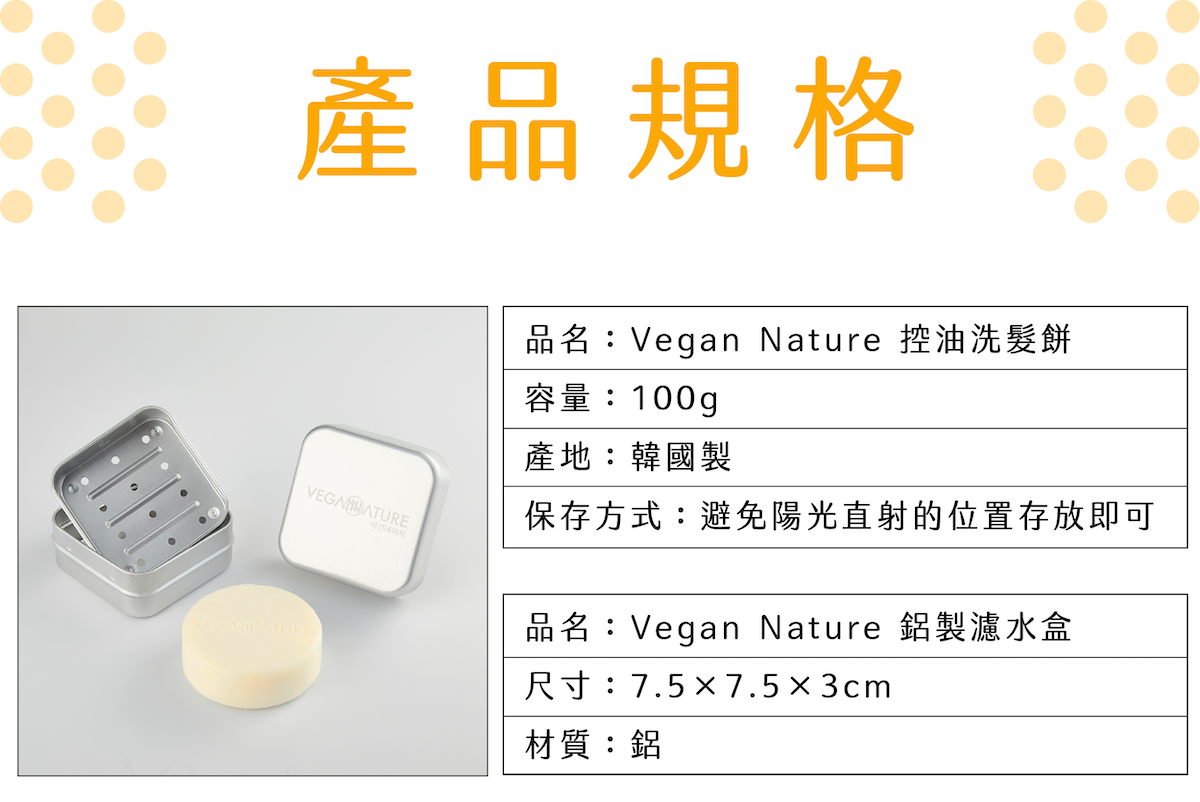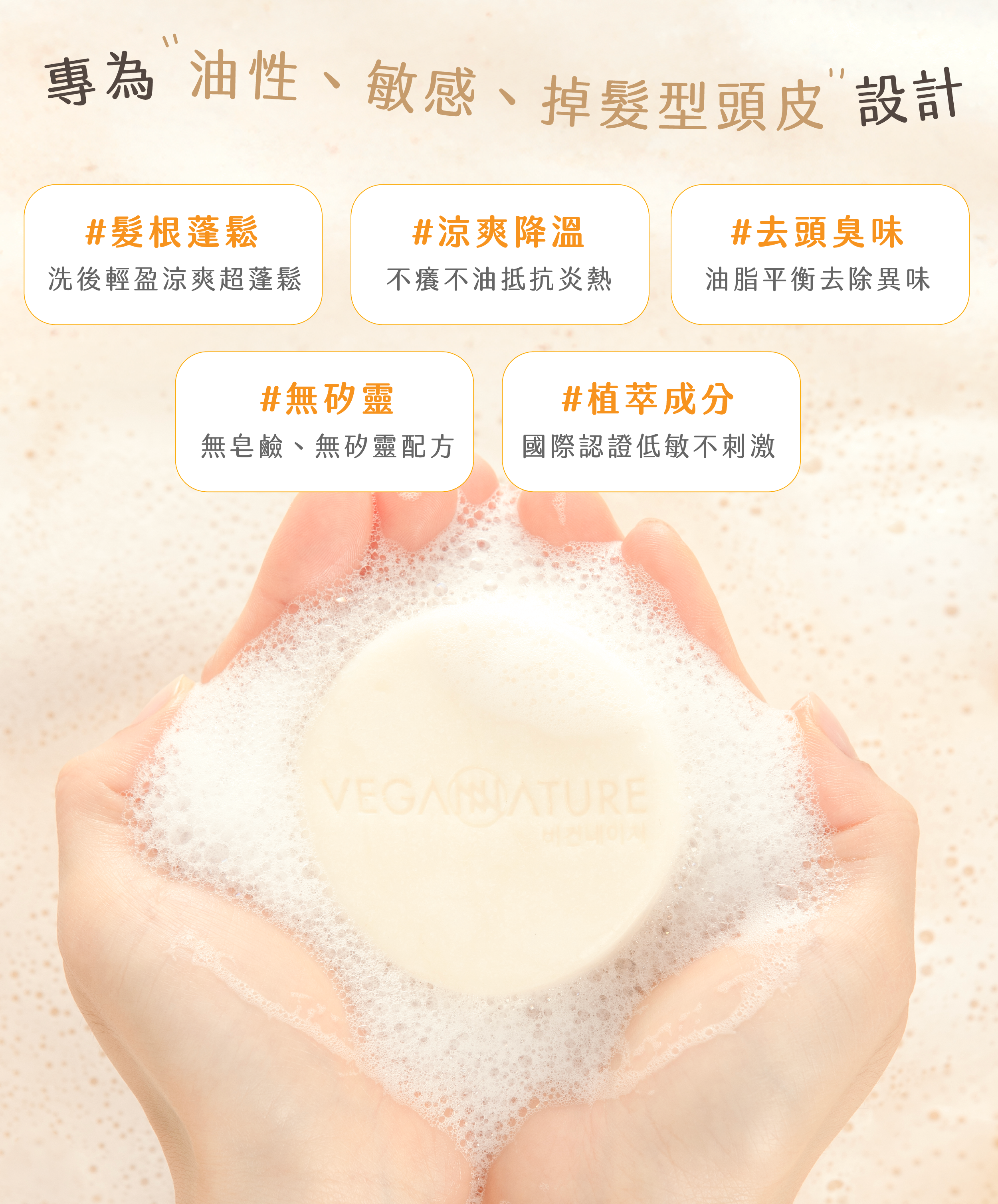 ⸨ Vegan Nature 控油洗髮餅 ⸩ 來自韓國,為油性、敏感、掉髮型頭皮設計,使用五種植萃成分,從根本改善頭皮問題,養成健康頭皮環境,打造亮麗秀髮。
